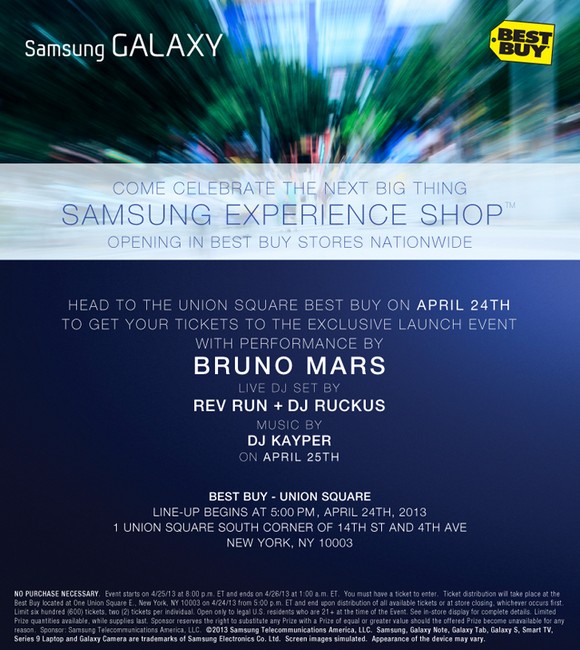 Hosted by Samsung, Bruno Mars will perform tomorrow, the 25th, followed by a DJ set from Rev Run and DJ Ruckus. To get tickets to the performance head over to Best Buy – Union Square today at 5 pm. Everything’s free…open bar + food + performances. What more could you ask for? See the flyer for more info.